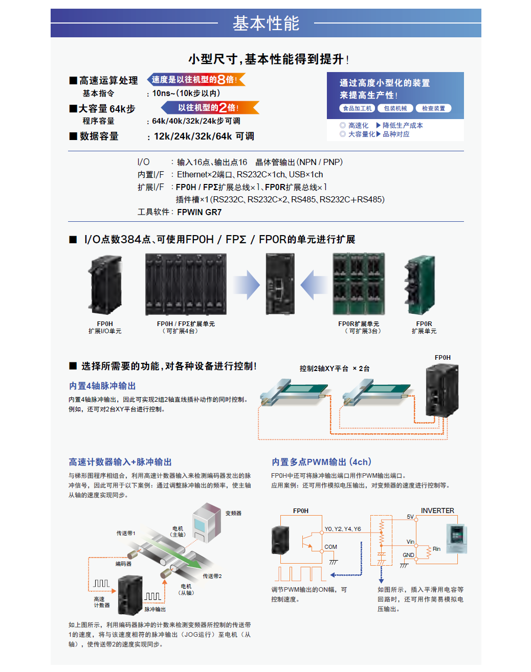 ·最大I/O點(diǎn)數(shù)384點(diǎn)、可使用FP0H / FPΣ / FP0R的單元進(jìn)行擴(kuò)展